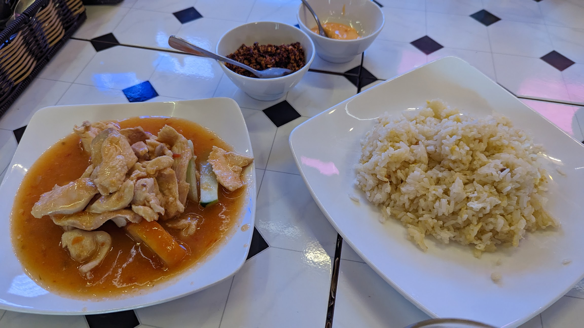 ターメリックライスにチキンが載ってて、パッションフルーツソースを掛けて味変できる。あとチキンスープみたいなのが付いてきた。