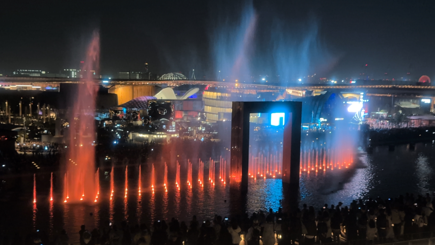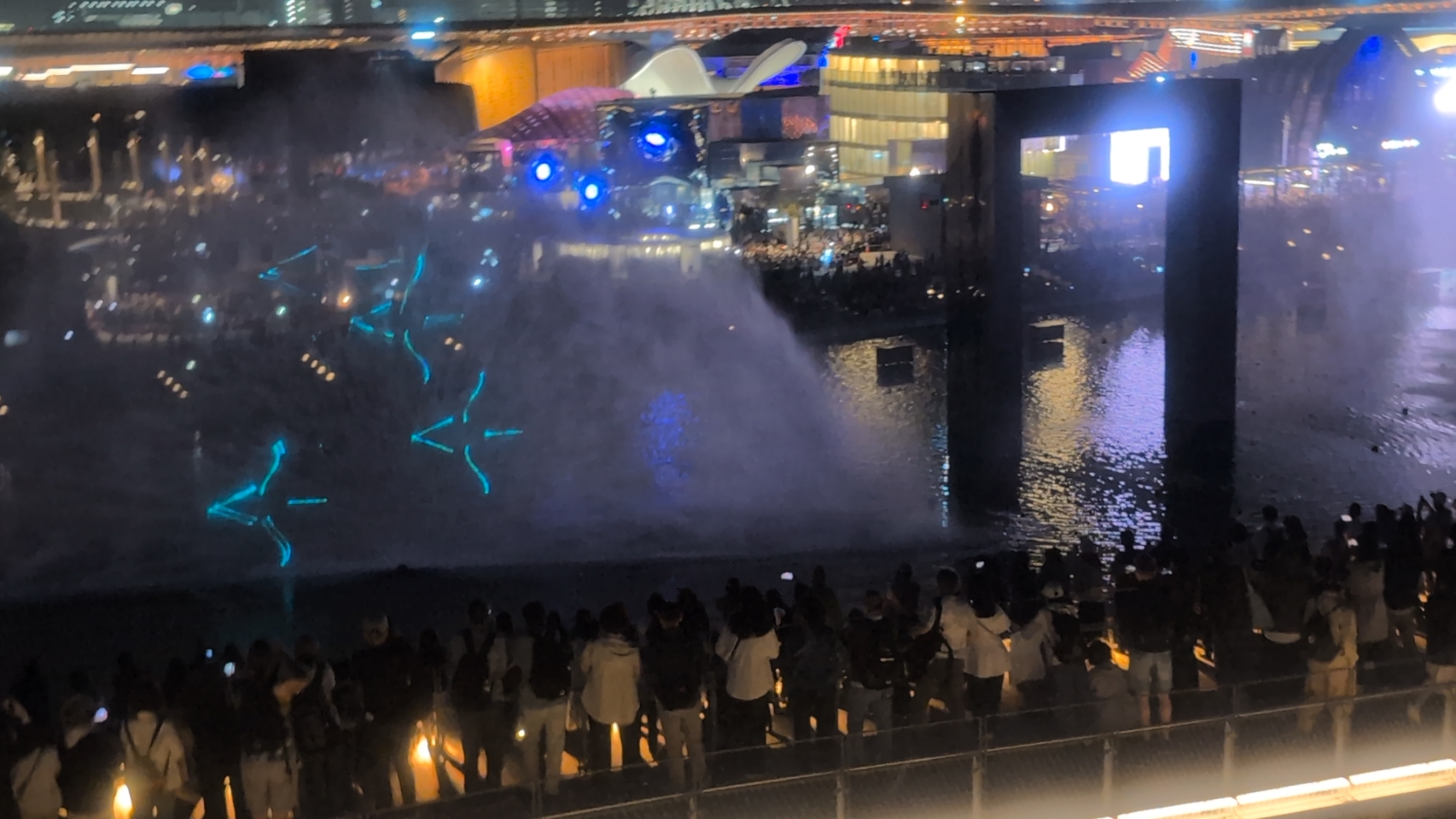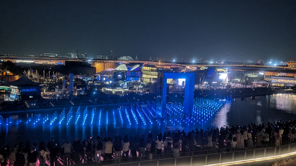 大屋根リングの一箇所に人集りが出来ていて、そこに近付いていくと、水と空気のスペクタクルショー 「アオと夜の虹のパレード」を観ようとしているということを理解した。ちょうど15分前だったので、どんなもんかとお溢れに預かることに。