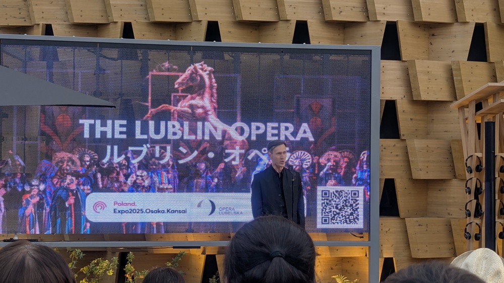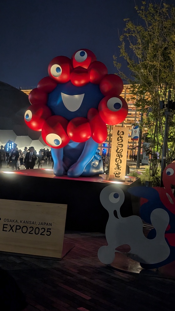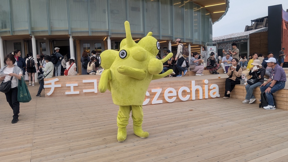 チェコパビリオンの前で酒を飲んでると、ミャクミャク感があるちょっとキモかわなキャラが出てきた。